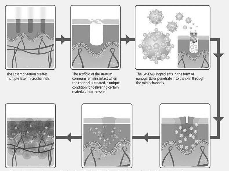 Besides resurfacing the skin to allow new skin to grow, LaseMD is a Cosmeceutical Delivery System (CDS). Typical cosmetic ingredients have great difficulty penetrating the skin barrier. With LaseMD, the serum penetration rate is greatly enhanced – We can now customize the LaseMD treatment according to your skin concerns by varying the serum to be used – something which has never been done before with fractional laser treatments.